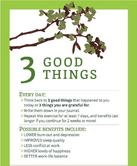 وهنا يتحدث مؤسس علم النفس الايجابي "د.مارتن سيلجمان" عن طريقة الثلاث اشياء وهي ببساطة: