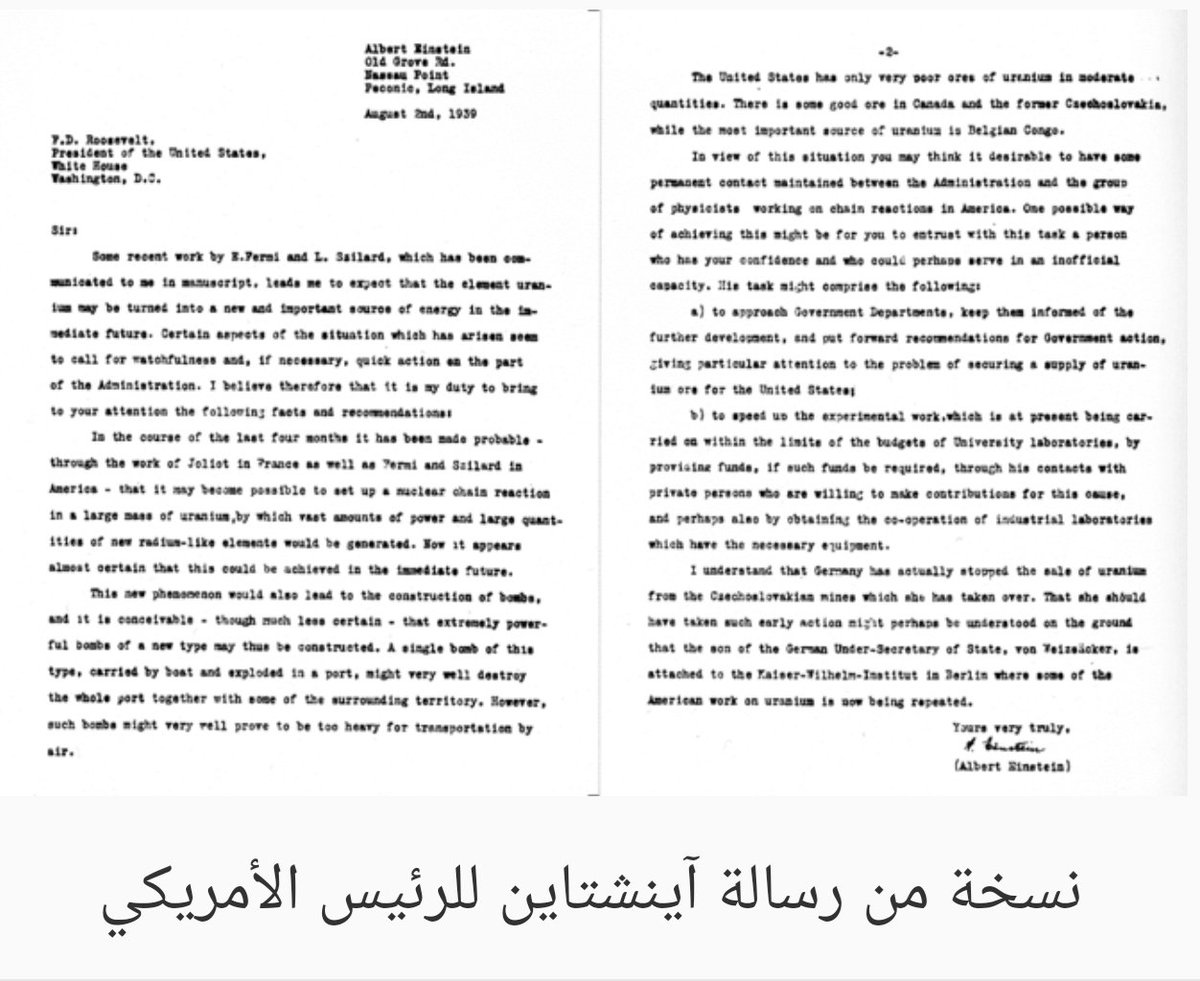 الأميركي روزفلت يحذرونه فيها من اقتراب هتلر من امتلاك قنبلة يمكنها نسف مدن كاملة.. وكي يمنحا رسالتهما قوة ومصداقية عرضا على أنشتاين التوقيع عليها أيضاً.. أنشتاين لم يرحب فقط بالفكرة بــل وأضاف فقرة أرعبت روزفلت يقول فيها: "وقد وصل لعلمي أن هتلر منع تصدير اليورانيوم ....