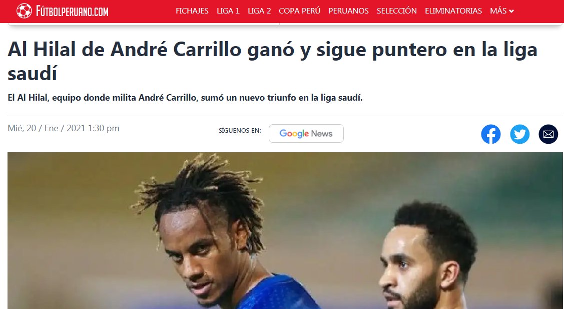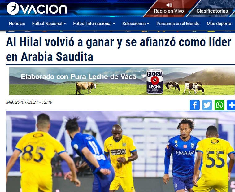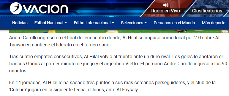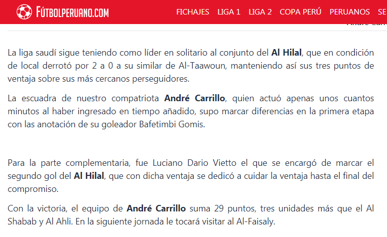 🔵🔵 صحيفة "futbolperuano" البيروفية: "فاز #الهلال على التعاون ولا يزال قائداً منفردا في الدوري السعودي.. كاريلو لعب لبضع دقائق فقط في المباراة.. ثنائية الهلال جاءت بطريقة ممتعة عن طريق جوميز وفييتو.. وصل الهلال إلى 29 نقطة بفارق ثلاث نقاط عن الشباب والأهلي".