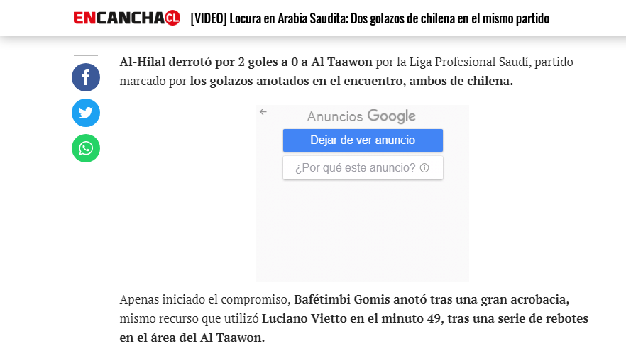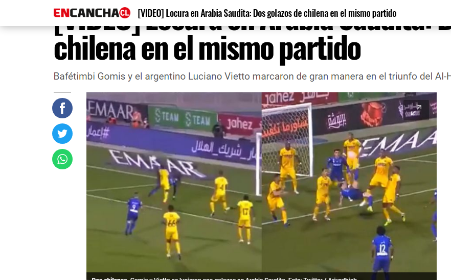 🔵🔵 صحيفة "encancha" التشيلية: "إنه الجنون في السعودية.. هدفان بالضربة المقصية في نفس المباراة.. فاز #الهلال على التعاون بثنائية خيالية.. سجل بافتيمبي جوميز الهدف الأول بعد أداء إيكروباتي رائع، وبنفس الطريقة أحرز لوسيانو فييتو الهدف الثاني".