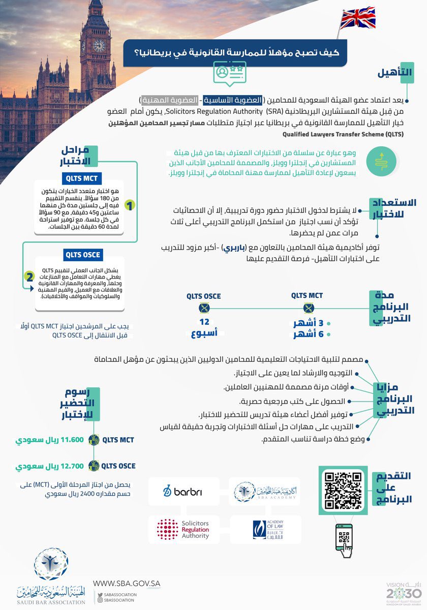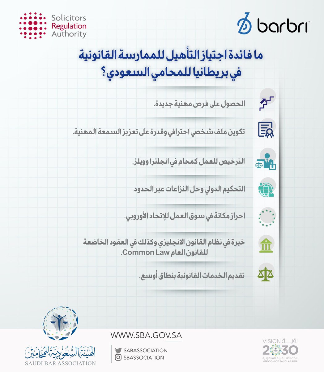 في سبتمبر 2018 اعتمدت هيئة المستشارين البريطانية Solicitors Regulation Authority (SRA) أعضاء #الهيئة_السعودية_للمحامين ضمن قائمة المحامين المؤهلين والدول المعتمدة للتقديم على برنامج تحويل المحامين المؤهلين Qualified Lawyers Transfer Scheme