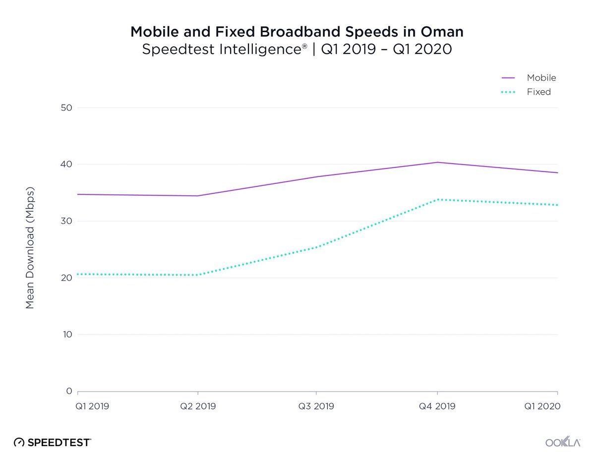 إحصائيات من @Speedtest عن أداء إنترنت النطاق العريض الثابت والهاتف المحمول في السلطنة (الربع الأول 2020-2019)