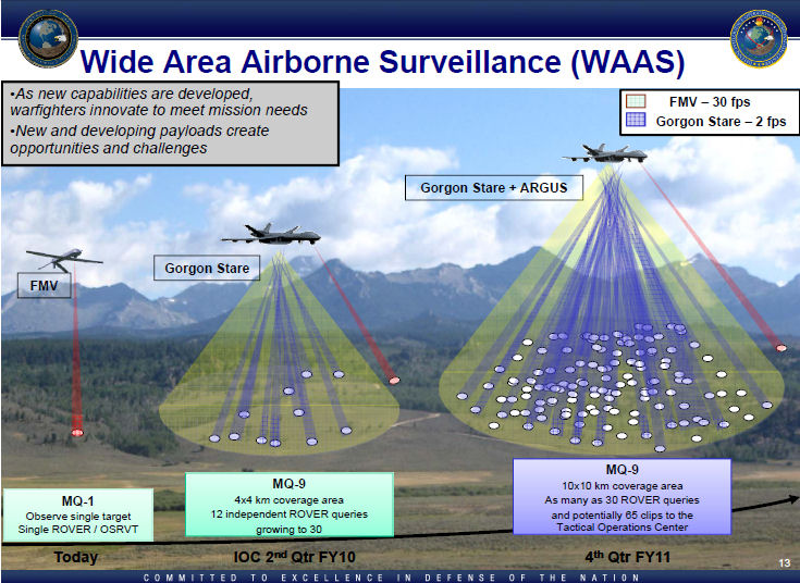 هنا تظهر القدرة الامريكية التي لا يشاركها فيها الا القليل. الاستطلاع المساحي او wide area survailance هذه القدرة تسمح للطائرات الامريكية الخاصة بالاستطلاع من التحليق على ارتفاعات شاهقة جدا فوق 60 ألف قدم والحصول على معلومات دقيقة عن نوعية الاهداف المحتلمة في المنطقة ذات الاهتمام.