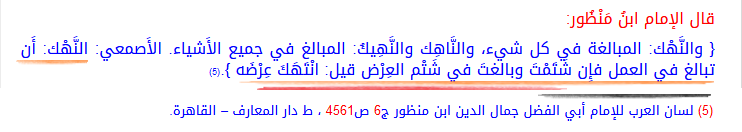 "النَّهْك:أَن تبالغ في العمل فإِن شَتَمْتَ وبالغتَ في شَتْم العِرْض قيل: انْتَهَكَ عِرْضَه"