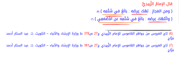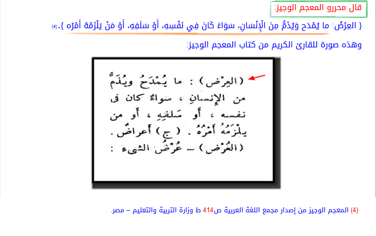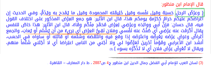 "العِرْضُ: ما يُمْدَح وَيُذَمُّ مِنَ الْإِنْسَانِ، سَوَاءً كَانَ فِي نَفْسِهِ، أَوْ سَلَفِهِ، أَوْ مَنْ يَلْزَمُهُ أَمْرُه"