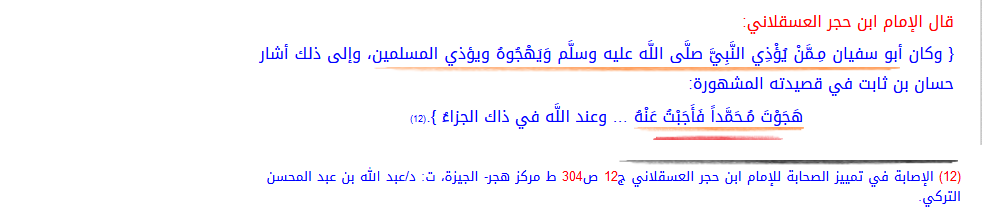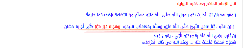 1-الإمام الحاكم بعد ذكره للرواية. وقد فسرها بان ابا سفيان هجا النبي وتكلم في عرضه.