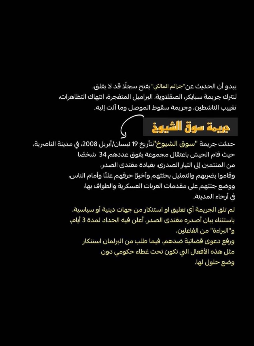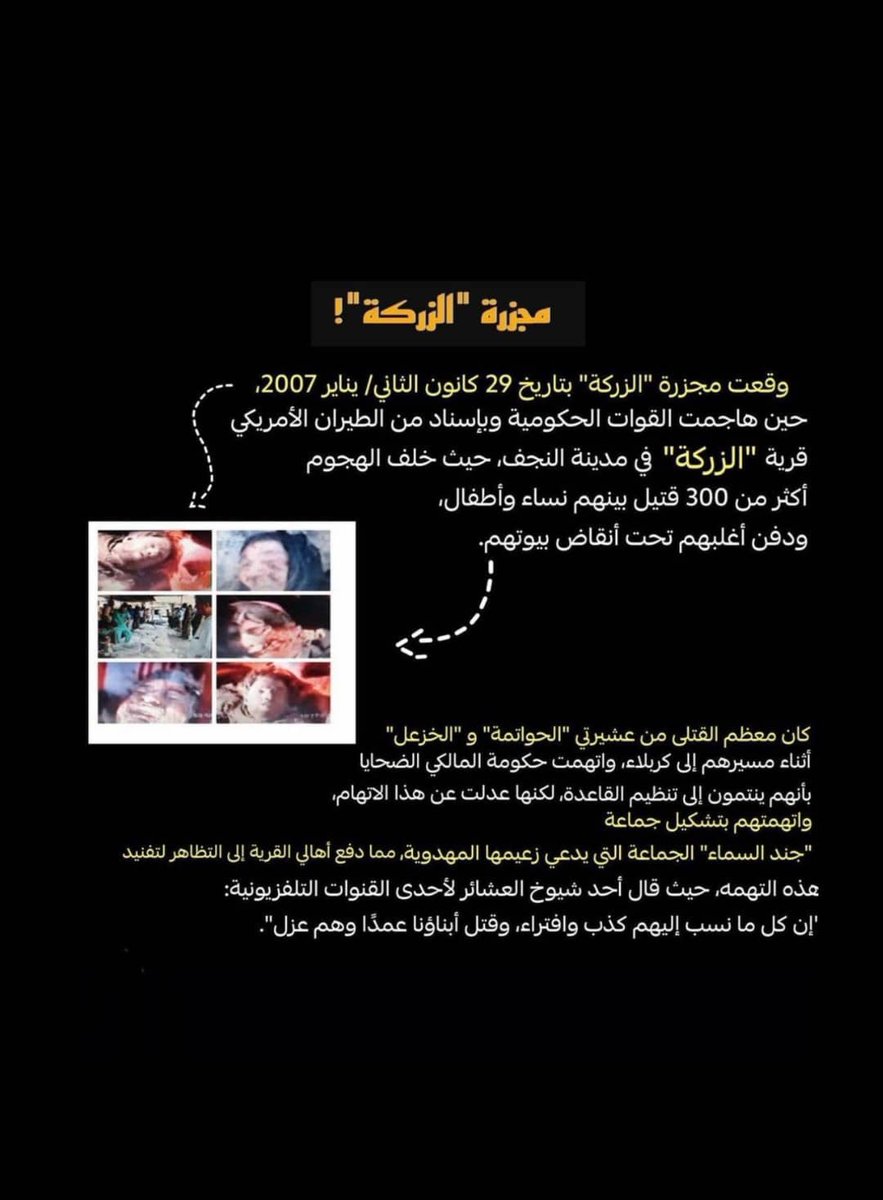 وفي عام 2019 عندما بدات تظاهرات تشرين قد وصف المظاهرات بانها يدعون الى اشياء غير اخلاقية وانهم عملاء لسفارات وانهم مندسين وقتله والخ……… والى الان يستمر نوري المالكي في تواصل مع الا*هاب وقبل يومين ارسل انتحاريين اثنين وفجره نفسهما وراح في العملية الارهابية 32 شهيد او اكثر يتبع