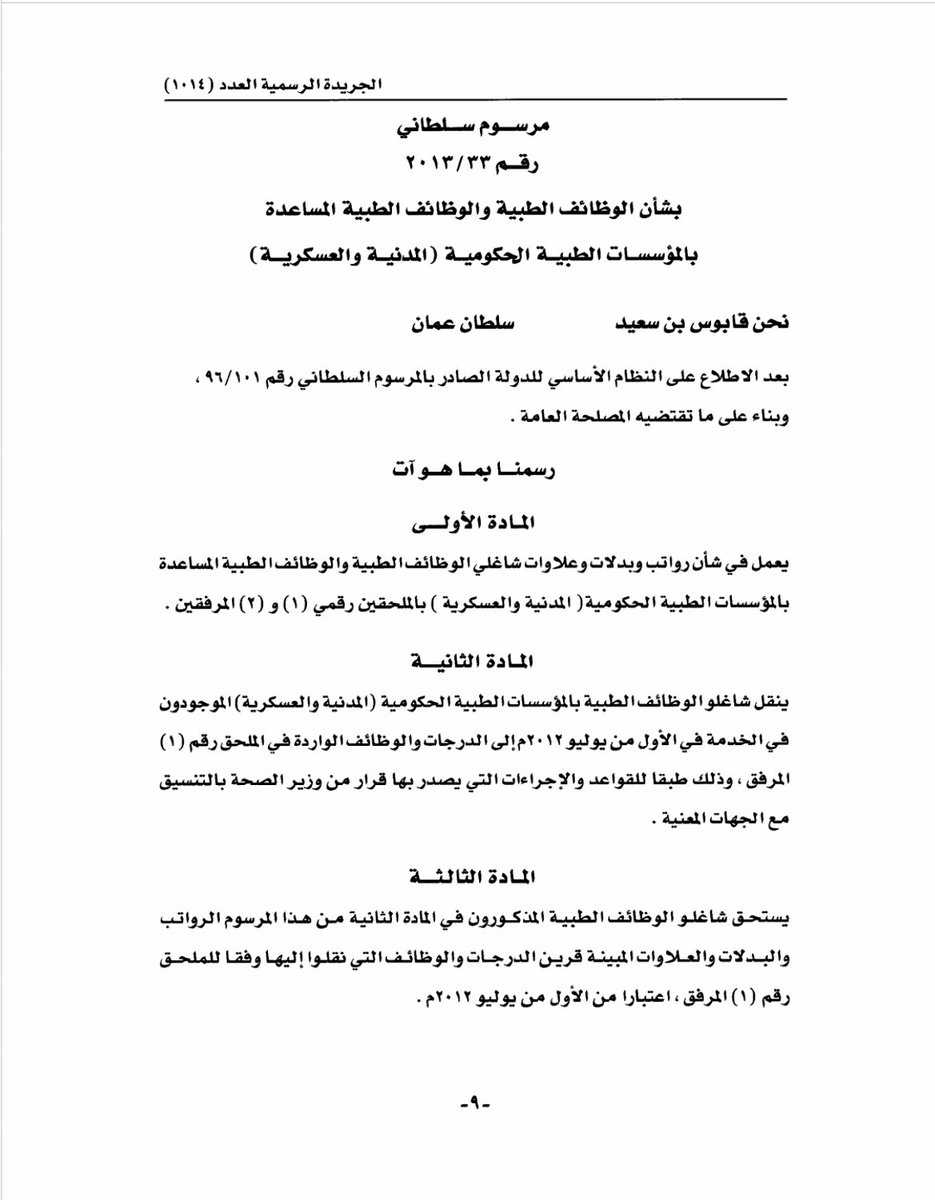 صدر المرسوم السلطاني رقم ٣٣/٢٠١٣ والذي ينص على توظيف طبيب (وليس طالب) الامتياز على الدرجة العاشرة براتب وبدلات يفوق مجموعها الـ١٠٠٠ ريال عماني.