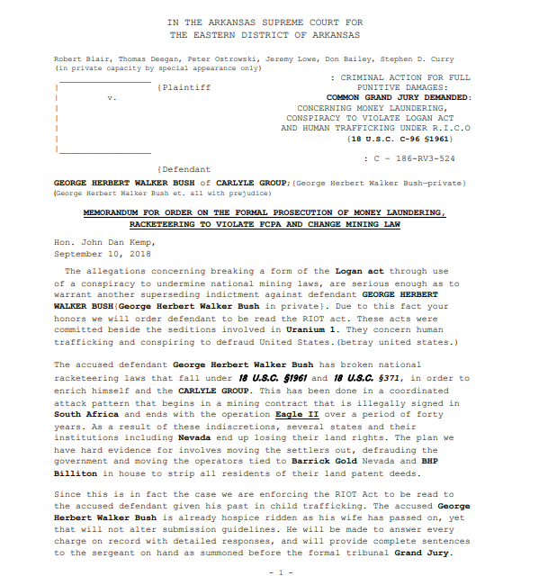 1️⃣ في محكمة أركانساس العليا للمنطقة الشرقية من أركانساس طلب من هيئة المحلفين الكبرى المشتركة: بشأن غسل الأموال والتآمر على انتهاك قانون لوغان والاتجار بالبشر بموجب قانون ريكو من CARLYLE GROUP ؛ (جورج هربرت ووكر بوش)