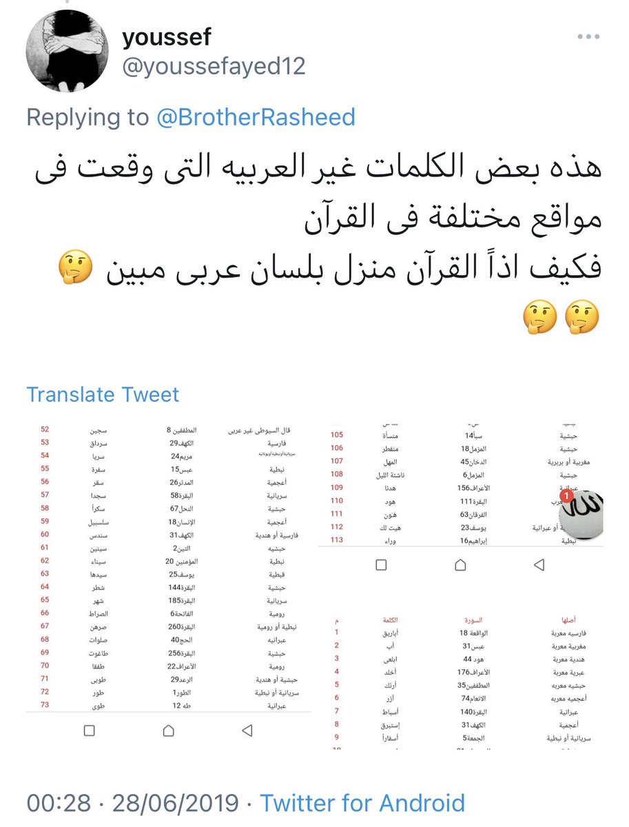 والان نرد على الشبهة الثانيه، انتم تقولون أنه قرآن بلسان عربي مبين، فلماذا هناك عدد كبير من الكلمات الغير عربيه موجوده في المصحف؟