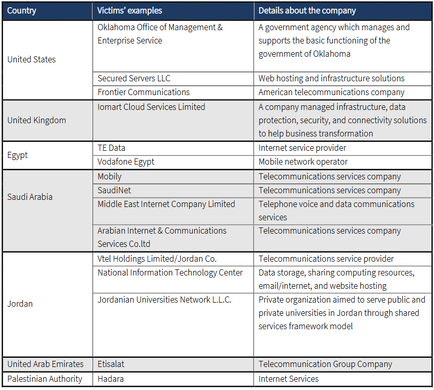 فرقة الاختراق التابعة لحزب الله اللبناني، بحسب التقارير، اخترقت مئات السيرفرات بالشرق الأوسط لشركات اتصالات ومزودي انترنت،في مصر، المملكة العربية السعودية، الإمارات، الأردن وفلسطين، وايضا شركات أمريكية وبريطانية. حيث استخدمت ثغرات وادوات مفتوحة المصدر.
