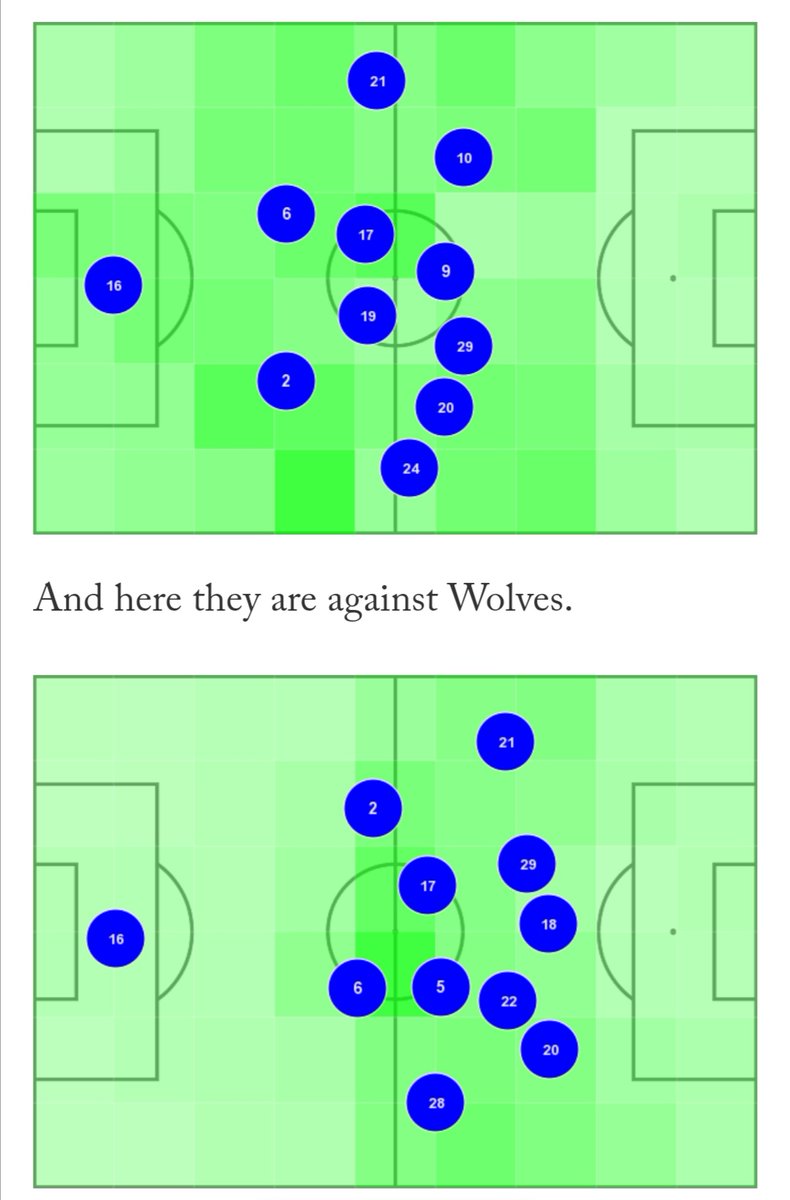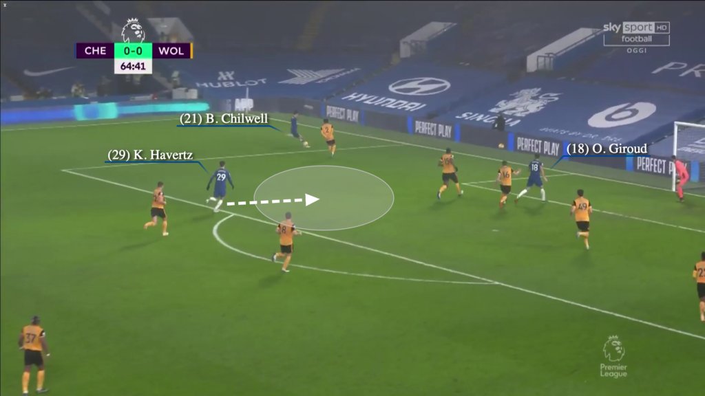 بصرف النظر عن الفريق بأكمله الذي يندفع لأعلى ضد كتلة الذئاب في مراكز منخفضة ، فإن الاختلاف الرئيسي هو أن سيزار أزبيليكويتا (رقم 28) في وضع يسمح له بدعم تياجو وروديجر أكثر من جيمس (رقم 24) في ملعب كينج باور ، إما كظهير أيمن أو ثالث قلب دفاع اعتمادًا على ما يطلبه زملاؤه