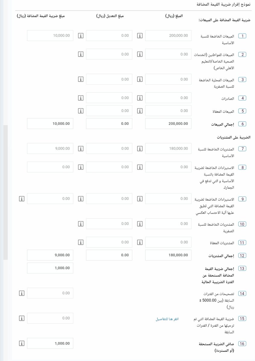 💠إذا احتاج المكلف التصحيح على نموذج الاقرار الضريبي بعد التقديم، يجب على المكلف تقديم نموذج التعديل إذا كان مبلغ التصحيح يساوي أو يزيد عن 5000.00 ريال سعودي أو يساوي أو يقل عن -5000.00 ريال سعودي فقط