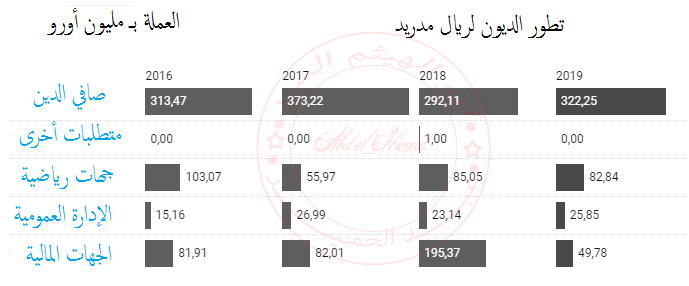 بالتقرير الإقتصادي بالرسم البياني فإن مبلغ صافي الدين (241 مليون) بدون مشروع تجديد ملعب البرنابيو الذي يقدر بـ 114 مليون يعني صافي الدين 355 مليون إعتبارا من يونيو 2020