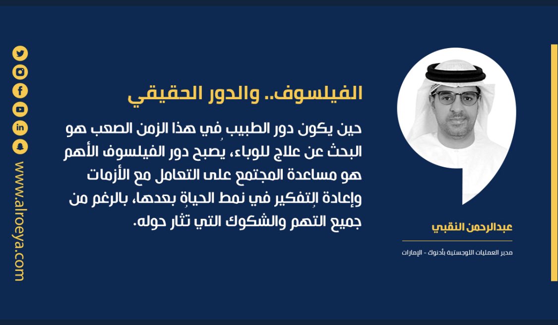٦/٥ فحين يكون دور الطبيب في هذا الزمن الصعب هو البحث عن علاج للوباء، يُصبح دور الفيلسوف الأهم هو مساعدة المجتمع على التعامل مع الأزمات وإعادة التفكير في نمط الحياة بعدها، وبالرغم من جميع التُهم والشكوك التي تُثار حول الفيلسوف، يبقى دوره لا غنى عنه للنهوض بفكر المجتمع.