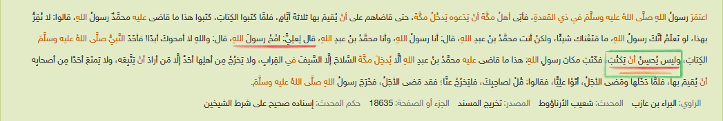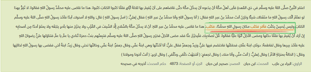 ثالثا: جاءت الرواية عن ((البراء)) في صحيح ابن حبان مصرّحة أنّ الرسول كان آمرًا بالكتابة لا مباشرا لها.