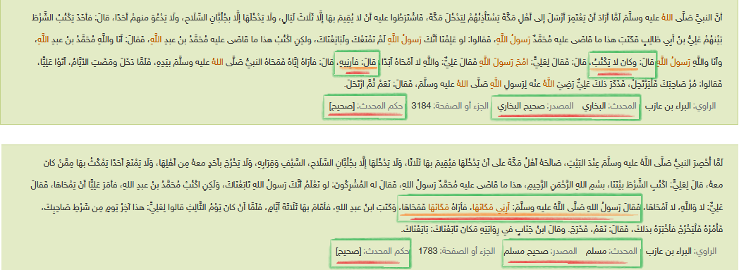 خامسا: جاء في رواية البخاري أنّ الرسول قد قال:"فارنيه" وفي رواية مسلم "أرني مكانها" وفي ذلك دلالة على أنهّ لم يكن يعرف القراءة، فكيف سيجيد الكتابة؛ إذ إنّ من لا يقرأ لا يكتب؟!