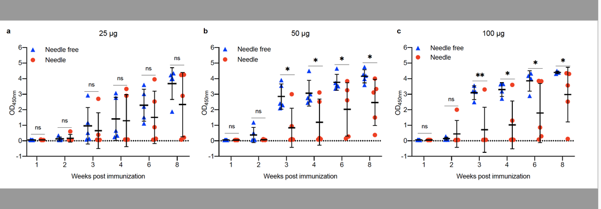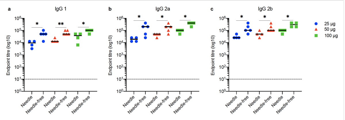 كذلك مكنت هذه الطريقة للحقن بدون ابر من استحثاث المناعة حتى عن طريق الحقن في الجلد مما يدل على قدرتها على تحسين المناعة والاستغلال الامثل للقاحات عن طريق التقليل من الجرعات وكمياتها