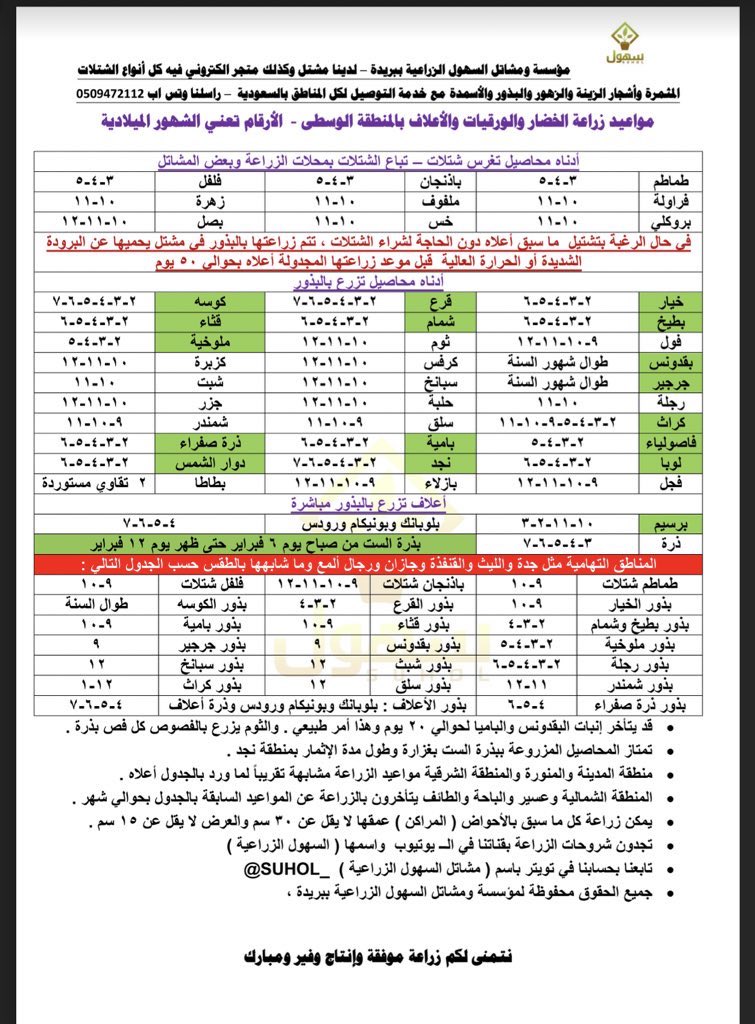( #بذرة_الست 6-12 فبراير ) . ولا يعني هذا أن الزراعة فقط في هذه الأيام الستة . بل يمتد موسم الزراعة حتى الشتاء القادم لبعض المزروعات حسب التقويم المرفق .