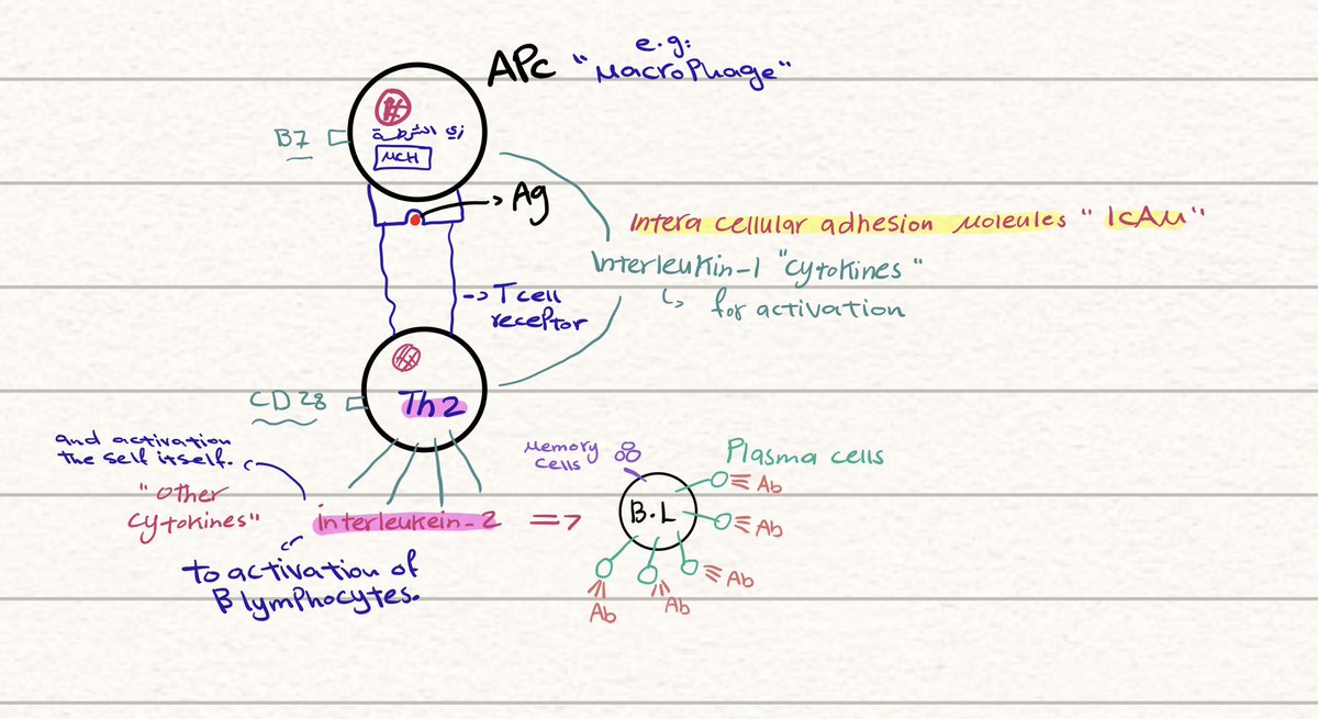 🦠 وبعدها تروح تنادي وتطلب المساعدة من الجسم وراح تجيها T-helper 2 وتمسك APC بيدها اللي هم T cell receptor وبعد مامسكت فيها APC بتطلع interleukin 1 “ types of cytokines” عشان يصير Activation for T-helper 2