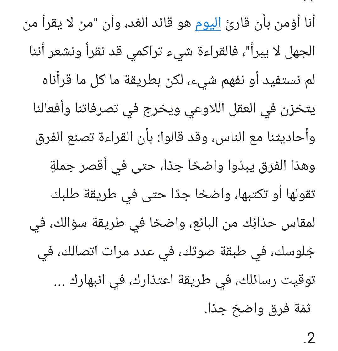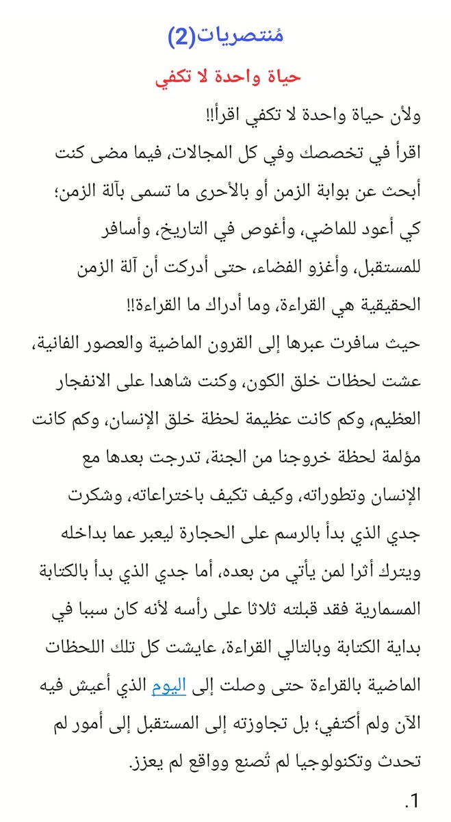 اقرأ في تخصصك وفي كل المجالات، فيما مضى كنت أبحث عن بوابة الزمن أو بالأحرى ما تسمى بآلة الزمن؛ كي أعود للماضي، وأغوص في التاريخ، وأسافر للمستقبل، وأغزو الفضاء، حتى أدركت أن آلة الزمن الحقيقية هي القراءة، وما أدراك ما القراءة!!....