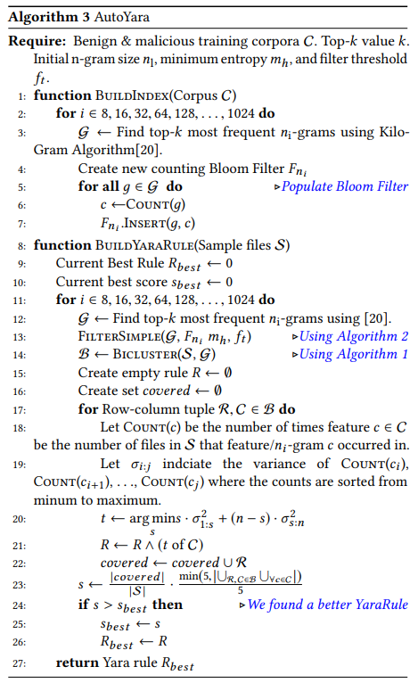 قدم باحثون أداة لتوليد Yara Rules أوتوماتيكيا تتفوق على YarGenوVxSig مما يوفر 44-86% من وقت المحلل لكتابة Rules لبرمجيات خبيثة أكثر تعقيداً.. استخدموا Large n-gram مع خوارزمية جديدة من نوع Biclustering
