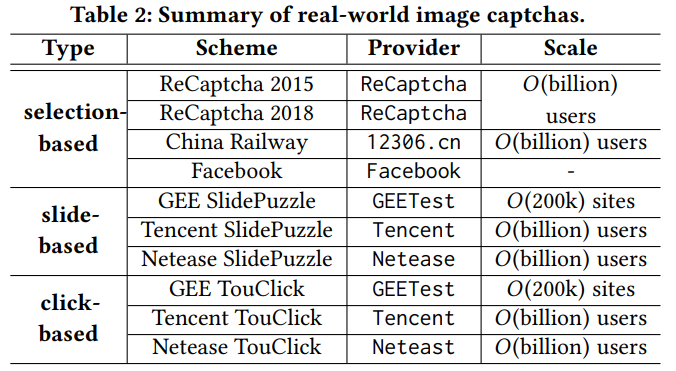 قدم باحثون طرق جديدة لتقييم مستوى الأمان لعشرة أنواع من Schemes المستخدمة في CAPTCHA وفعاليتها ضد ثلاثة أنواع من الهجمات SelAttack, SliAttack, and CliAttack.