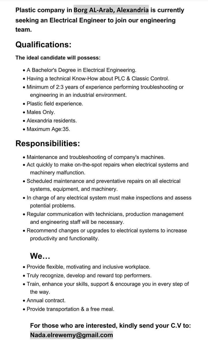 مطلوب مهندس كهرباء خبرة في اعمل المقاولات 3سنوات في نطاق مدينة رشيد واجوارها