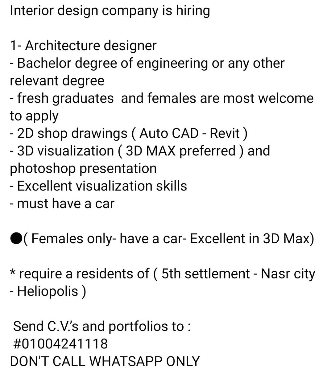 مطلوب للعمل لدي شركة مقاولات في زهراء المعادي مهندسات مكتب فني خبرة من ١-٣ سنين تخصص ميكانيكا وكهرباء