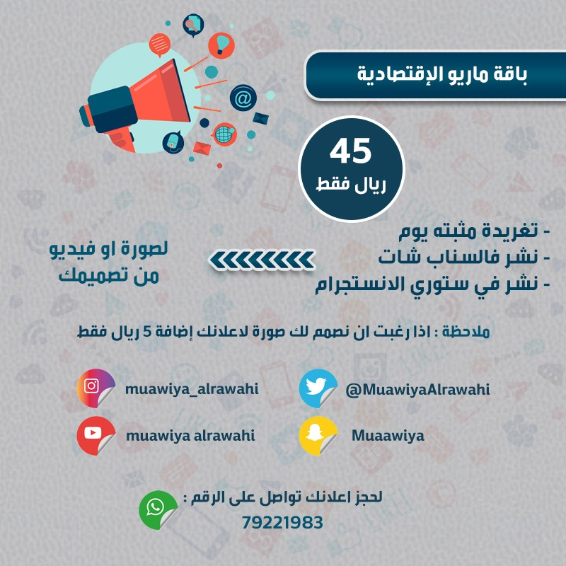 60: فيديو قصير لماريو وهو يتحدث عن مشروعك [بدون مونتاج] + نشر في تويتر مع تثبيت لمدة يوم + نشر في حالة الانستجرام + نشر في حالة سناب شات.