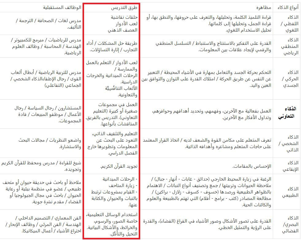 ( طرق التدريس ) المناسبة لأنواع الذكاء .