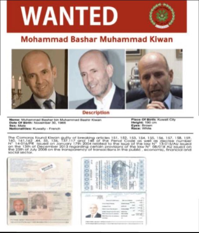 في حين أن كيوان مطلوب في ولايات قضائية أخرى بتهمة اختلاس أفراد، فإن إدانته الجنائية في جزر القمر تتعلق باختلاس عائدات من مخطط بيع جوازات السفر الذي كان العقل المدبر له، والمعروف باسم تبادل الجنسية بين الإمارات وجزر القمر! 4️⃣