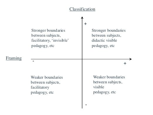 وهذة العناصر عندما تكون +C و +F تكون visible pedagogy (التعليم الظاهري) وعندما تكون العناصر -C و -F تكون invisible pedagogy (التعليم غير الظاهري)