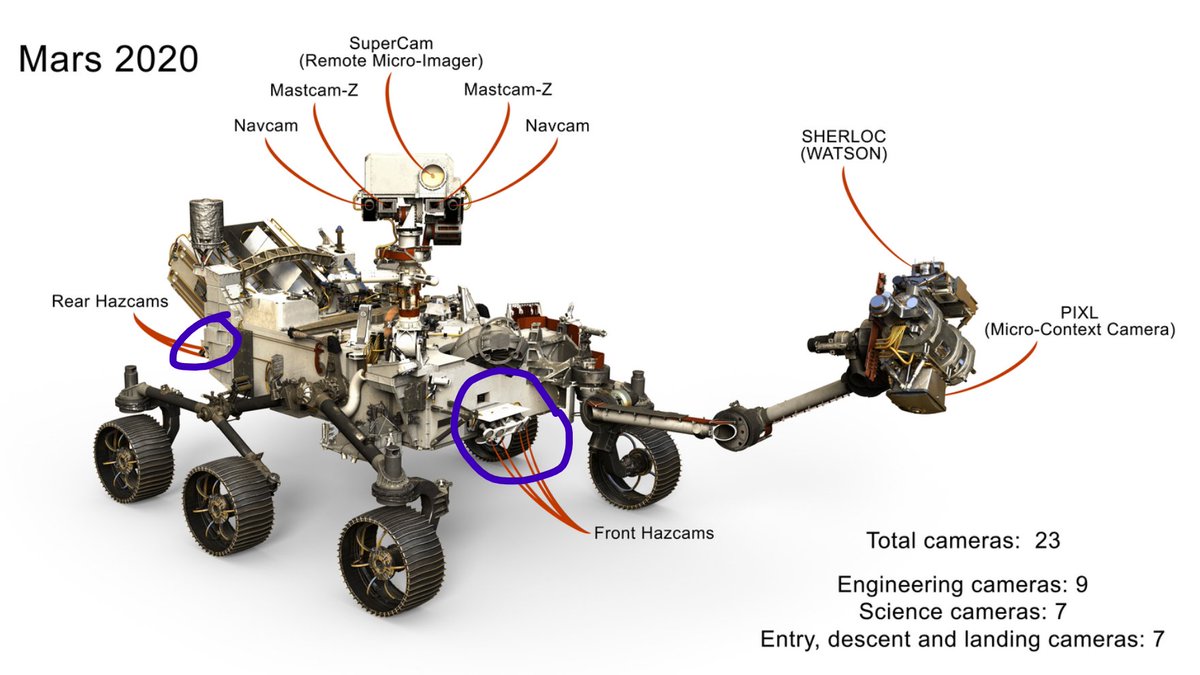 الكاميرات الأربعة Hazcams هدفها تصوير الأرض، لمعرفة المخاطر أثناء الحركة، لا تحتاج لأن تكون مجهزة بأحدث وأغلى أنواع الكاميرات في هذا المكان، قدرة الكاميرا على قدر المهمة المطلوبة، أما الكاميرات القوية، فهي في العمود أو السارية والذراع، وهما مجهزتان بكاميرات دقيقة وملونة.