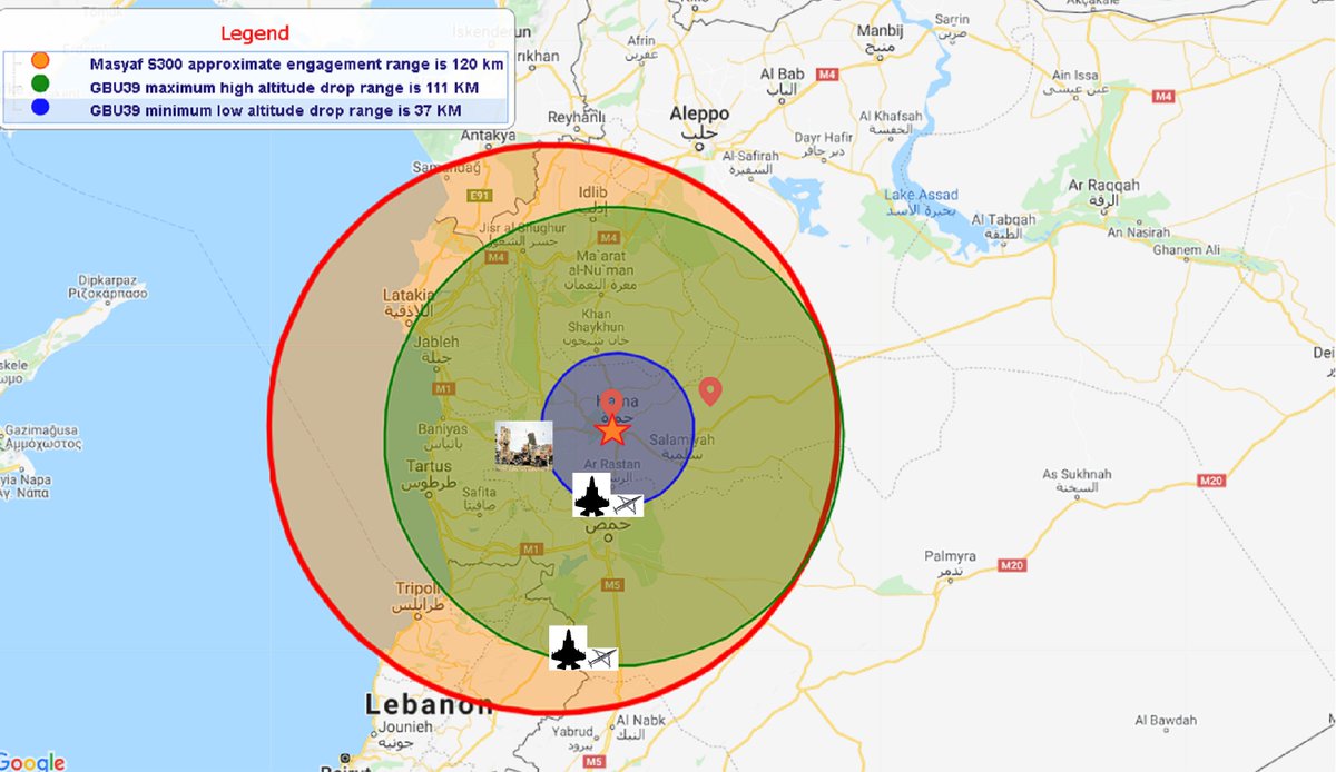 العمق السوري والخروج من نفس الاتجاه تقريباً، وفي الصورة موضح تقريباً المدى الأقصى والادنى لإطلاق قنبلة GBU-39SDB كما موضح المدى التقريبي لاشتباك الصواريخ لل S-300 السوري اذا كانوا يستخدموا صواريخ من نوع ال 9M96E2 ، وغالباً قامت المقاتلات الإسرائيلية بإلقاء قنابلها ما بين