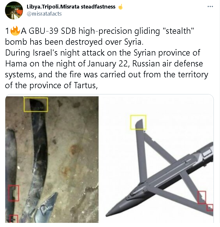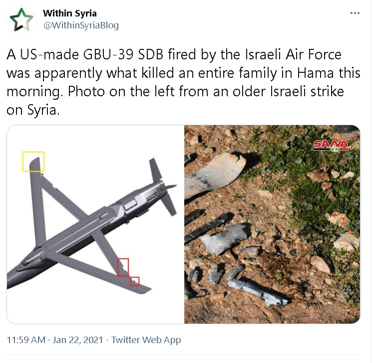 الهجوم على حماة في 22يناير2021، كان مختلف،تم استخدام قنابل GBU-39SDB حيث قام بعض السوريين بتصوير بقايا القنبلة