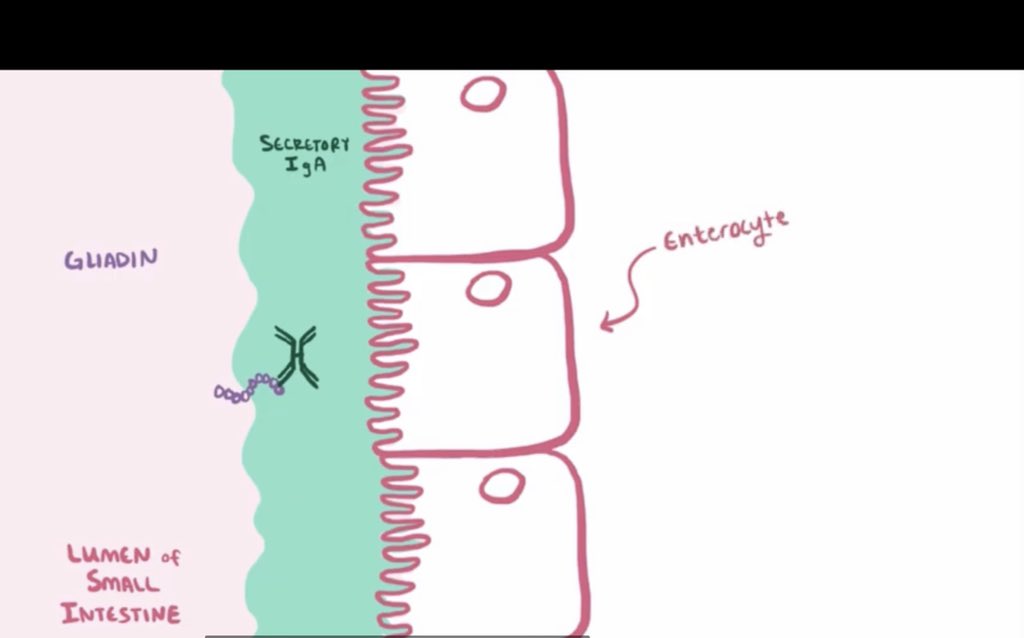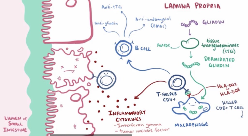 في الحالة الطبيعية لما أكل الجلوتين بيدخل المعدة وبيتكسر إلى gliadin والgliadin مايتكسر ف بيدخل الى small intestine