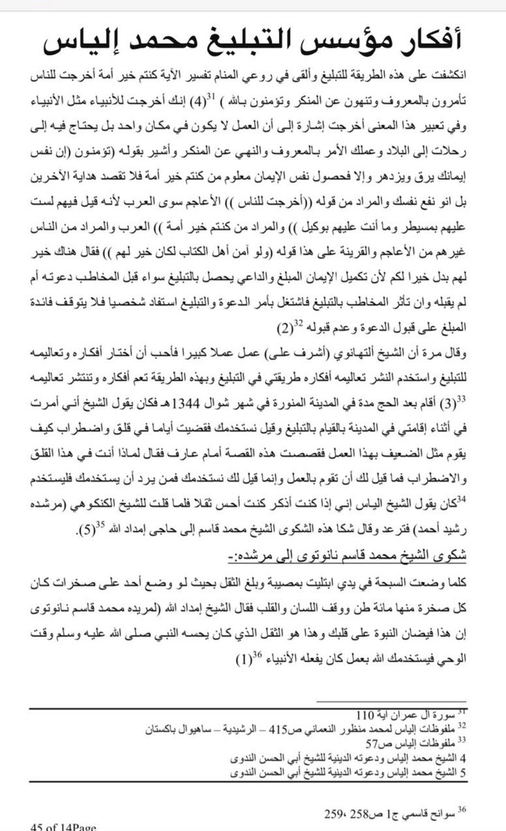 من كِتاب جماعة التبليغ عقيدتها وأفكار مشايخها(محمد ميان محمد أسلم)في بحثه المقدم للجامعة الإسلامية بالمدينة النبوية عن جماعة التبليغ وقد التزم بالنقل من مصادرهم