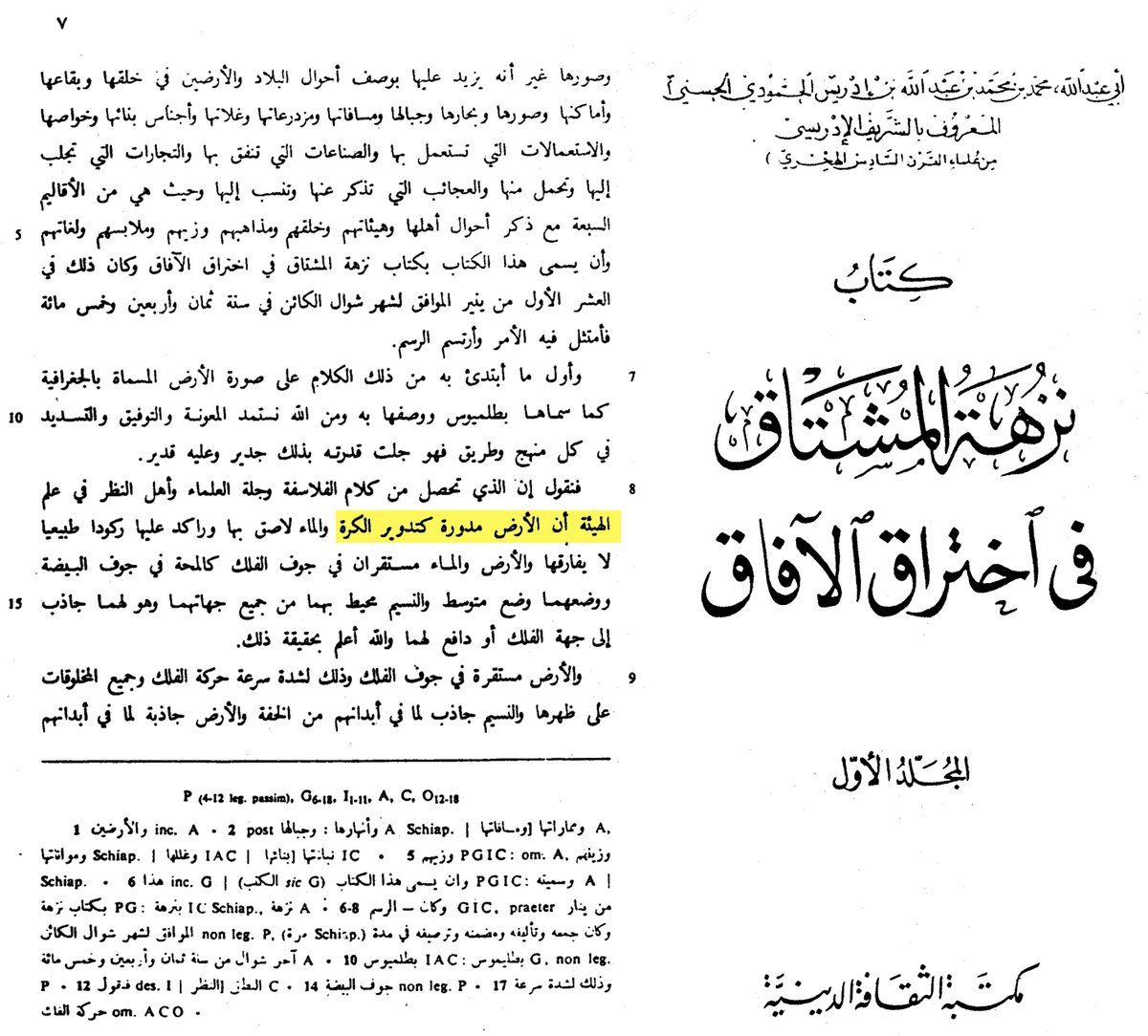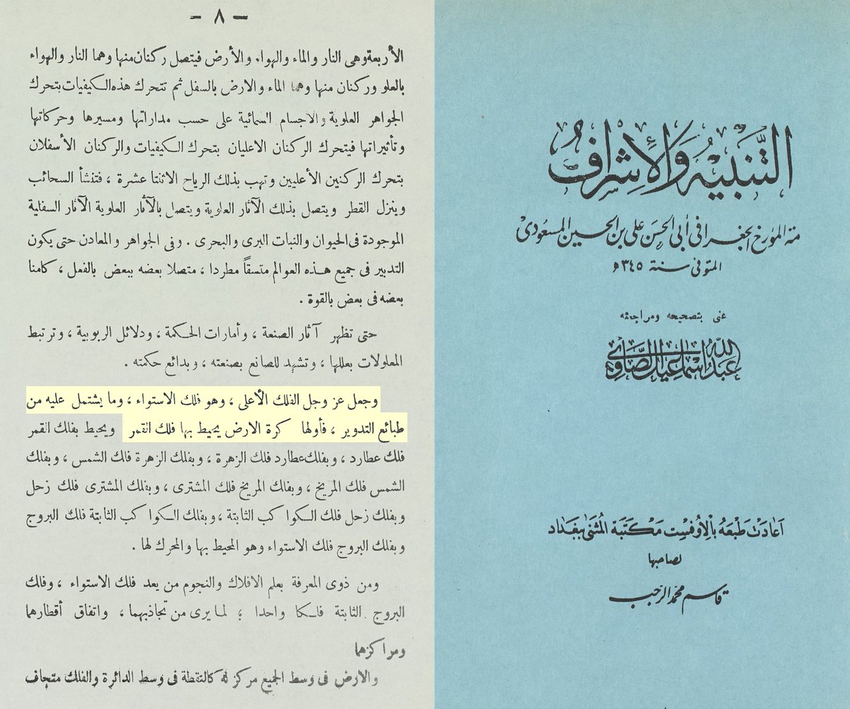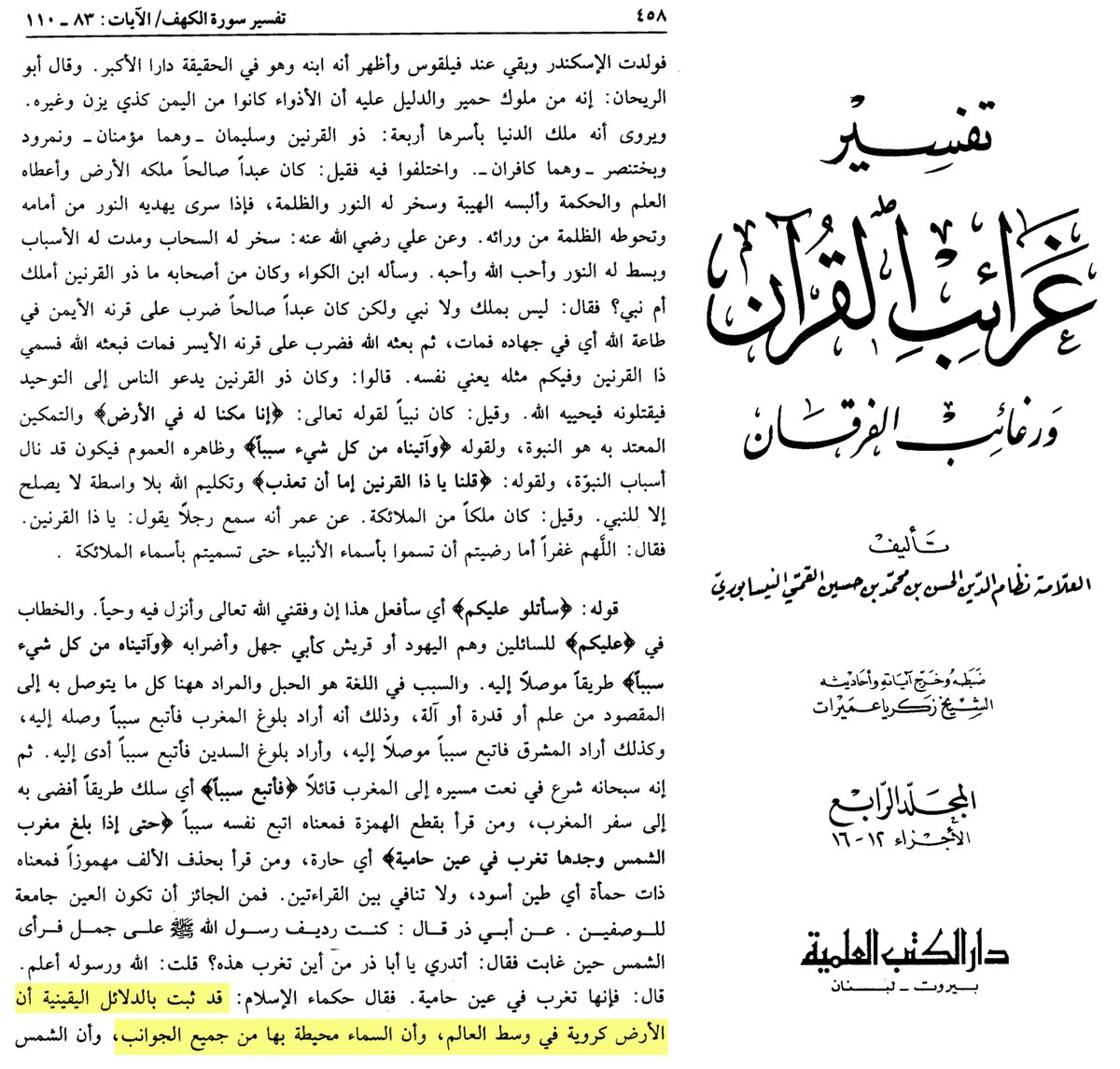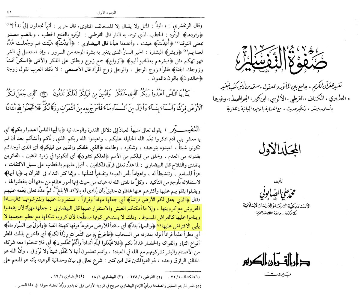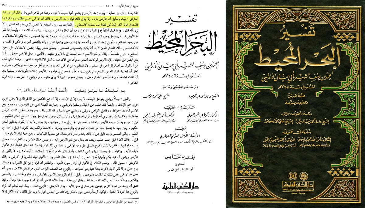 (مد الأرض-والأرض مددناها-وإلى الارض كيف سطحت-والأرض بعد ذلك دحاها-بساطا-فراشا) فكون الارض منبسطة نسبةللانسان يزرعها ويبنيها لا ينفي كرويتها كجرم كبير بل يثبته حيث لا تكن الارض ممدودة دائما إلا لو كانت كرة لأنها لو مسطحةسيكون لها حواف تعوق مدها الدائم