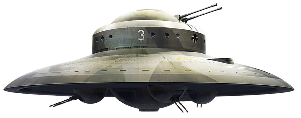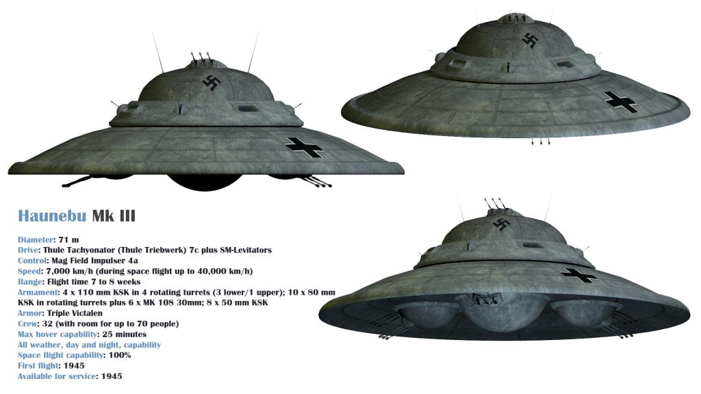 (ادعاء) : صنع الألمان مركبات أو أطباق طائرة تعتمد على انتاج قوة معاكسة للجاذبية الأرضية تؤدي لارتفاعها عن الارض و تتحرك بسرعة عالية على رأسها سلسلة HAUNEBU باصداراتها الأربعة