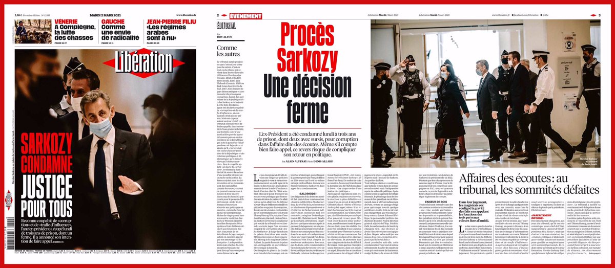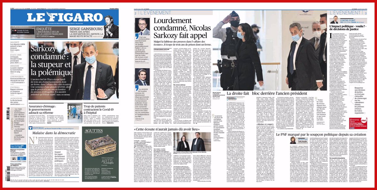 تصدرت الصحافة العالمية والفرنسية إدانة محكمة فرنسية للرئيس الفرنسي السابق نيكولا ساركوزي ومحاميه وقاضي تحقيق سابق في قضية "التنصت"حيث أمر بسجن #ساركوزي لمدة 3 سنوات بينهم سنة مع النفاذ بتهم الفساد واستغلال النفوذ