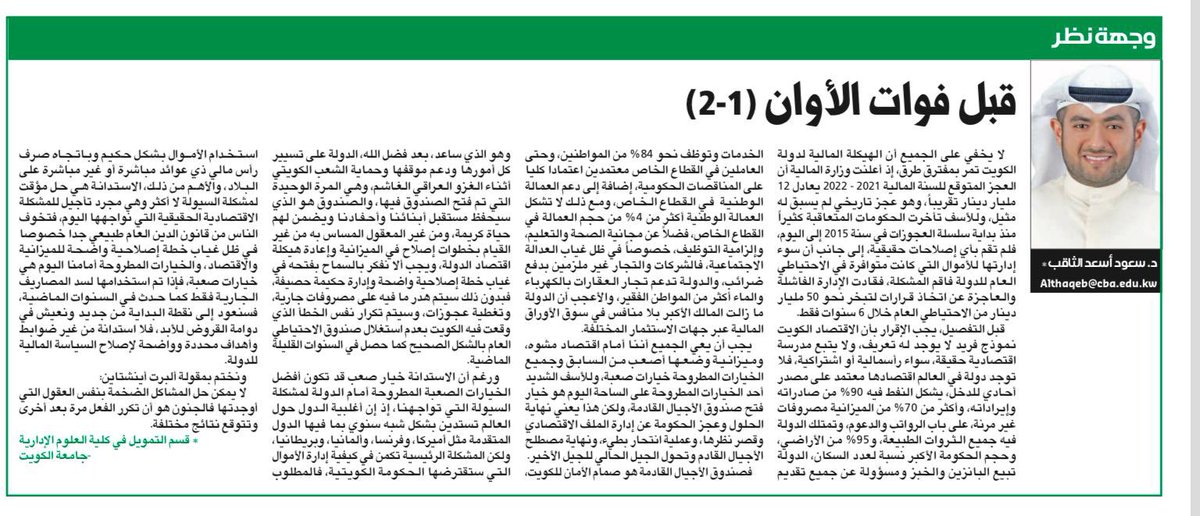 أتحدث فيه عن الاقتصاد الكويتي وصندوق الأجيال القادمة والجيل الأخير والاستدانة