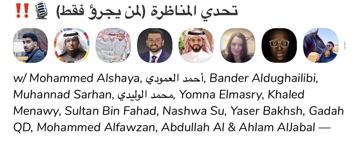 تحدي المناظرة (لمن يجرؤ فقط) @m7mdshay3, @SarhanMuhannad, @Dr_Alwaleedi, @YomnaCNY, @MeNaWy1, @sfsg90, @Nashwa_as, @BakhshYaser, @iNobody_i, @Alfawzan15, @abushgran, @reves77