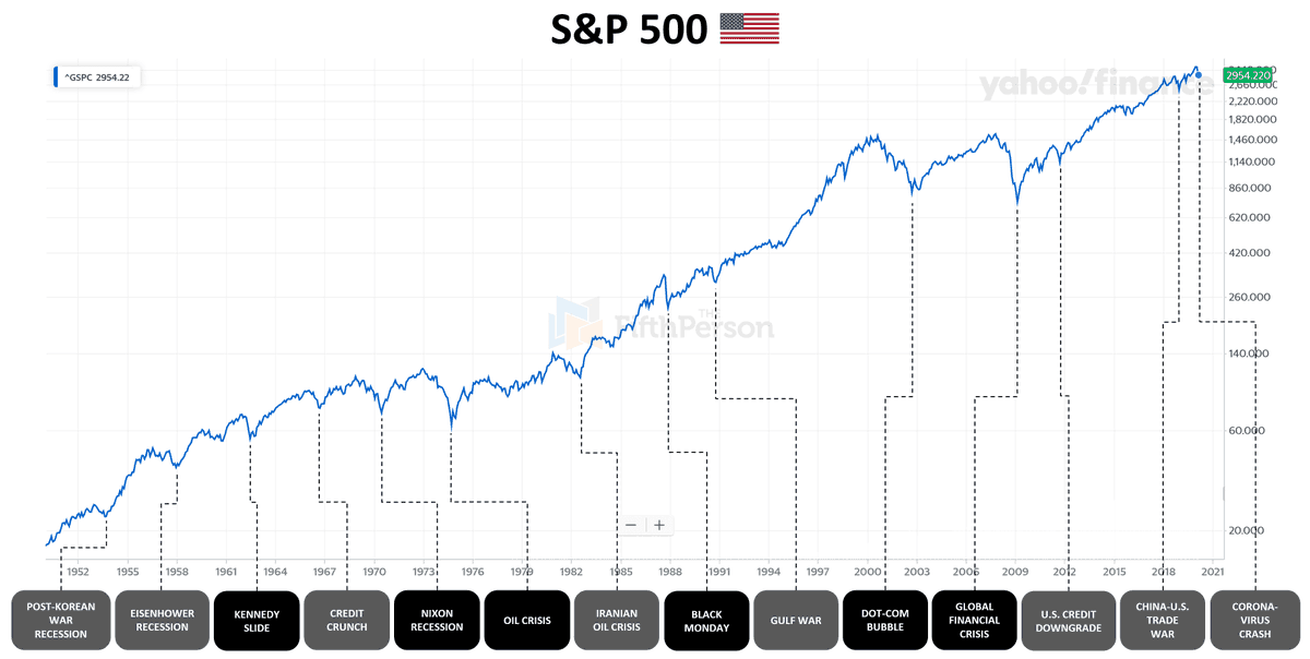 من عام ١٩٥٧ الى ٢٠٢١ مر SP500 بـ ٧ اختبارات قويه ( نزول اكثر من ٣٠٪) راح استعرض هذه الحوادث معكم ان شاء الله.