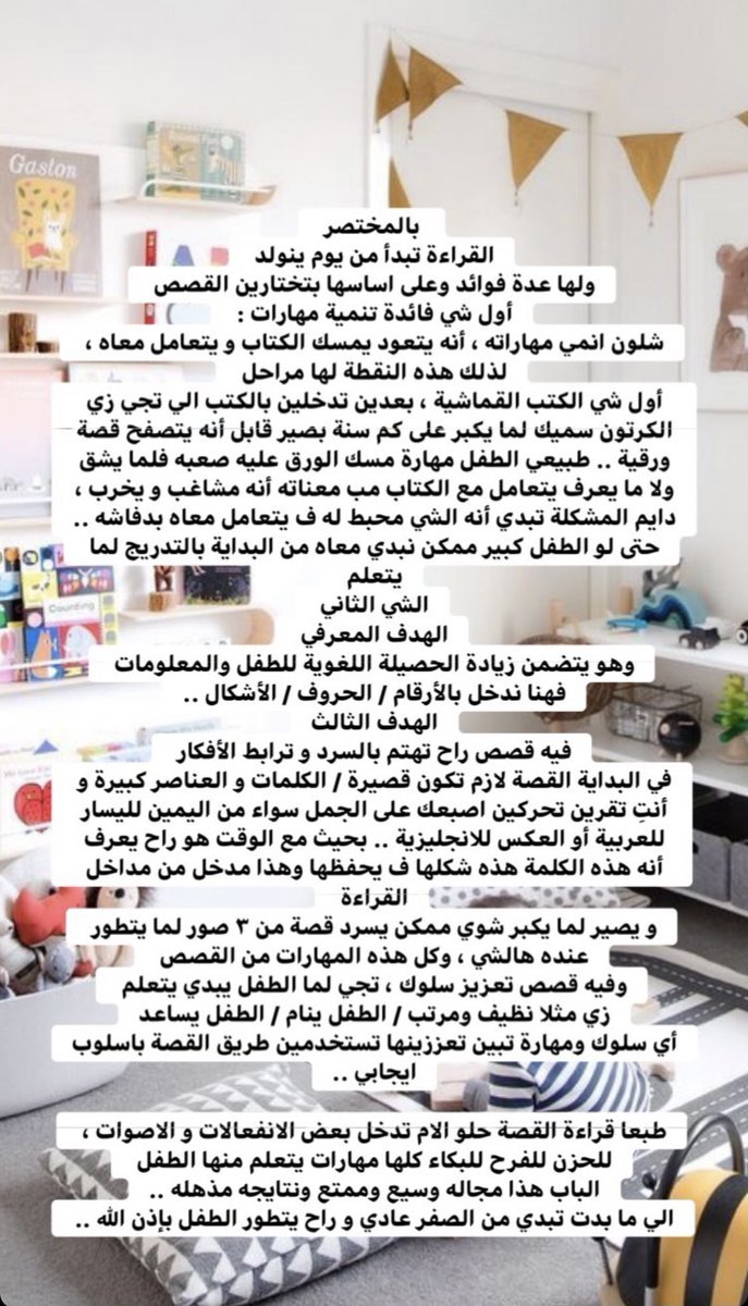 بدأت بالقراءة لأطفالي باللغتين من أول ايامهم ، ولاحظت عليهم حبهم الشديد للكتب و الاستمتاع فيها و المحافظة عليها ❤️.. لو خيرت أن استمر على شيء واحد لاخترت قراءة القصص دون تردد ..