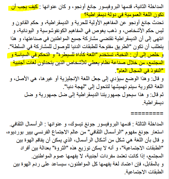 قال محاضر في جامعة كورية في ندوة تناقش "التلوث اللغوي": "الديمقراطية تقتضي مشاركة جميع المواطنين.. والنخبة قد تستخدم اللغة كأداة للسيطرة والتحكم في السياسة والمجتمع، من خلال صناعة نظام يعطي للأشخاص الذين يتحدثون لغات أجنبية النفوذ في المجال العام"🤔