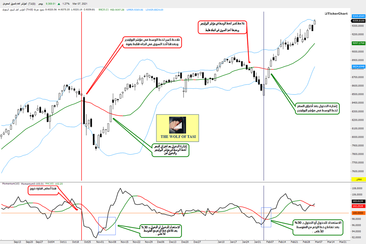 #ثريد لاستراتيجيات فنية على مؤشر الزخم Momentum وهو من المؤشرات التي تسبق حركة السهم (السعر) ومن هذه المؤشرات التي تسبق السعر كل من :