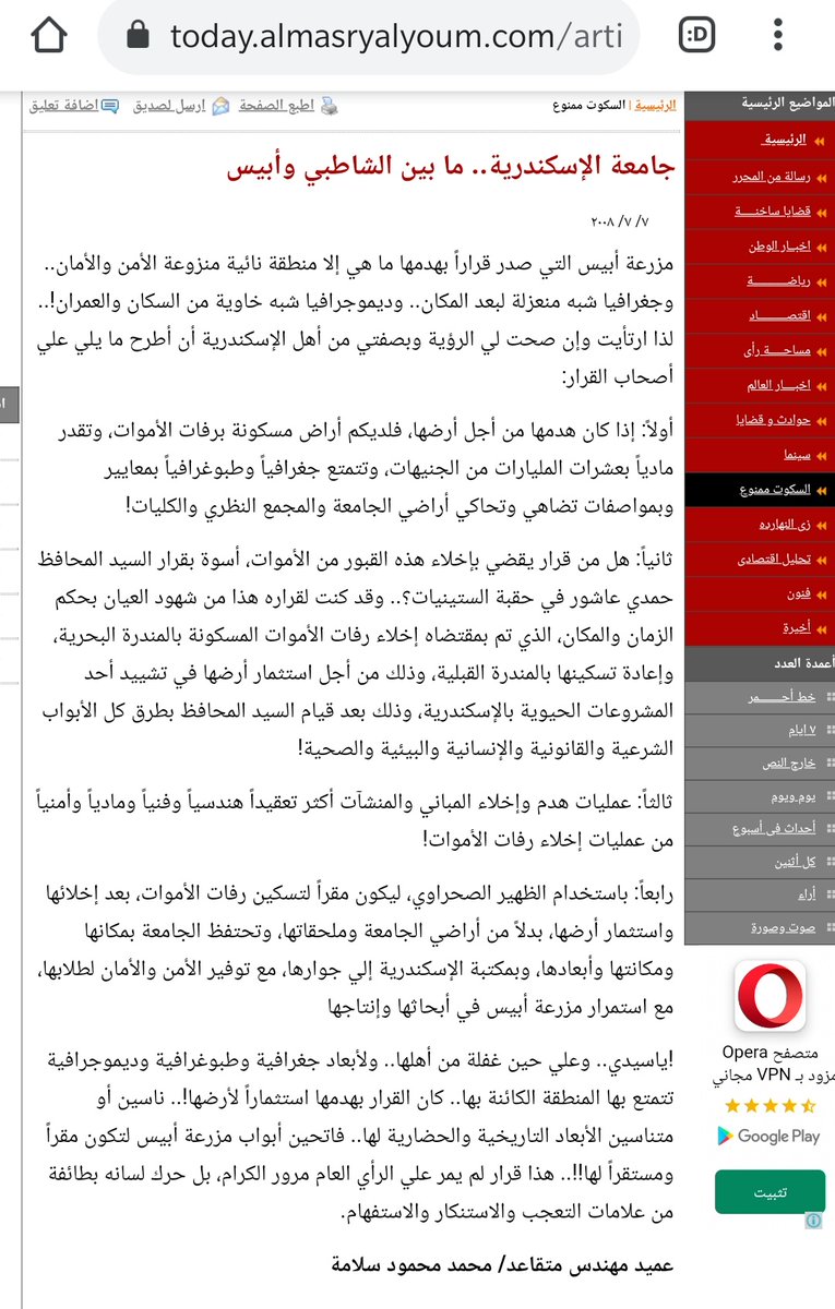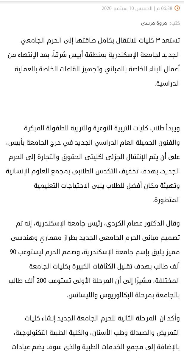 الإنشاءات بدأت من سنتين، وسيتم نقل الكليات للمباني الجديدة تباعًا، جزئيًا كليات التجارة والحقوق، تليها الكليات العلمية. ورغم الادعاء أن المباني تقع في منطقة يسهل الوصول إليها، إلا أن كل ساكني الإسكندرية يعلمون جيدًا أن وسائل المواصلات العامة للمكان محدودة وفيها إنهاك للطلاب.