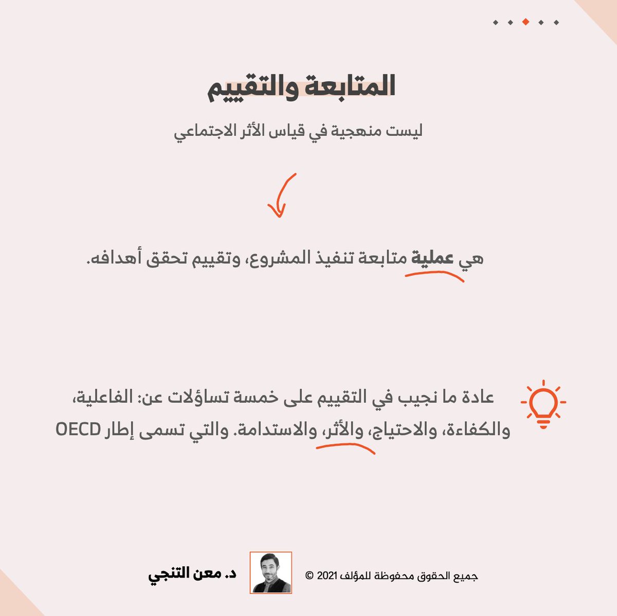 #المتابعة_والتقييم آلية إدارية مع المشاريع التنموية، لا يشترط فيها استخدام إطار معين. إطار #OECD هو الأشهر، ومن ضمن مكوناته: #قياس_الأثر