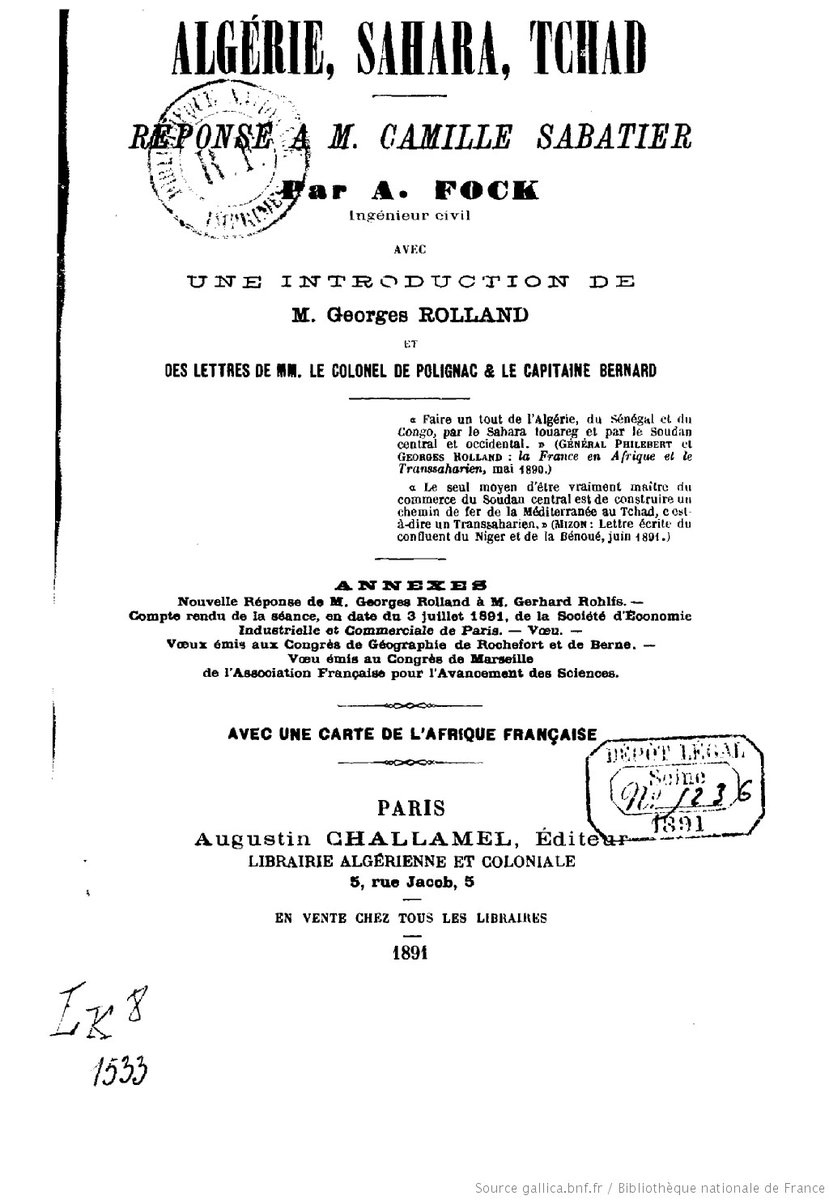 Algérie, Sahara, Tchad. Réponse à M. Camille Sabatier / par A. Fock,... ; avec une introd. de M. Georges Rolland; et des lettres de MM. le colonel de Polignac le capitaine Bernard [Edition de 1891]